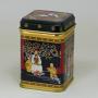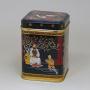 Kovová, dobře těsnící těsnící dóza na čaj s tradičním orientálním dekorem dívky připravující a servírující čaj. |